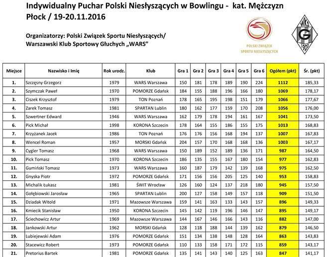 Indywidualne Puchar Polski Niesłyszących w Bowlingu Kobiet i Mężczyzn, Płock, dn. 18-20.11.2016r.